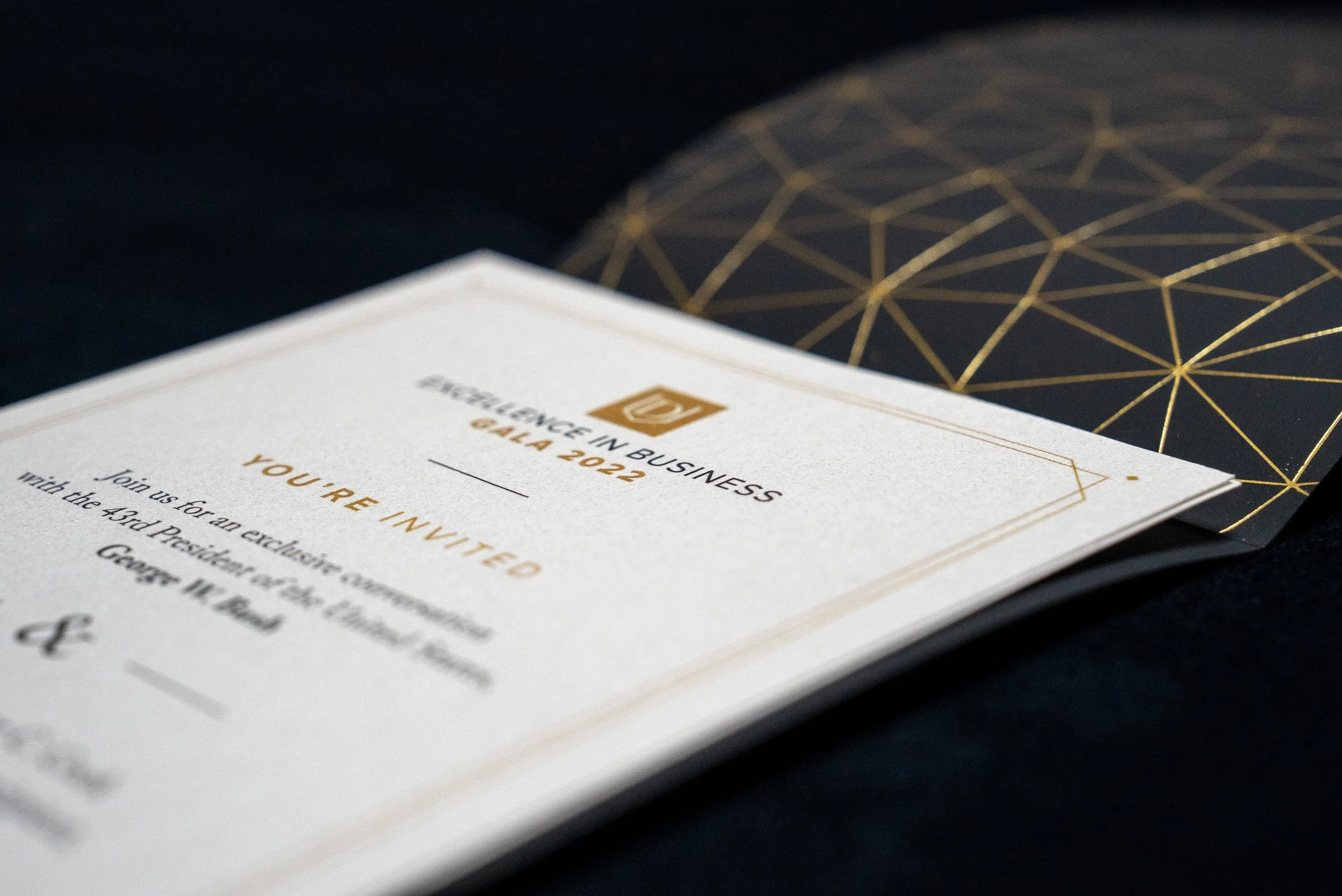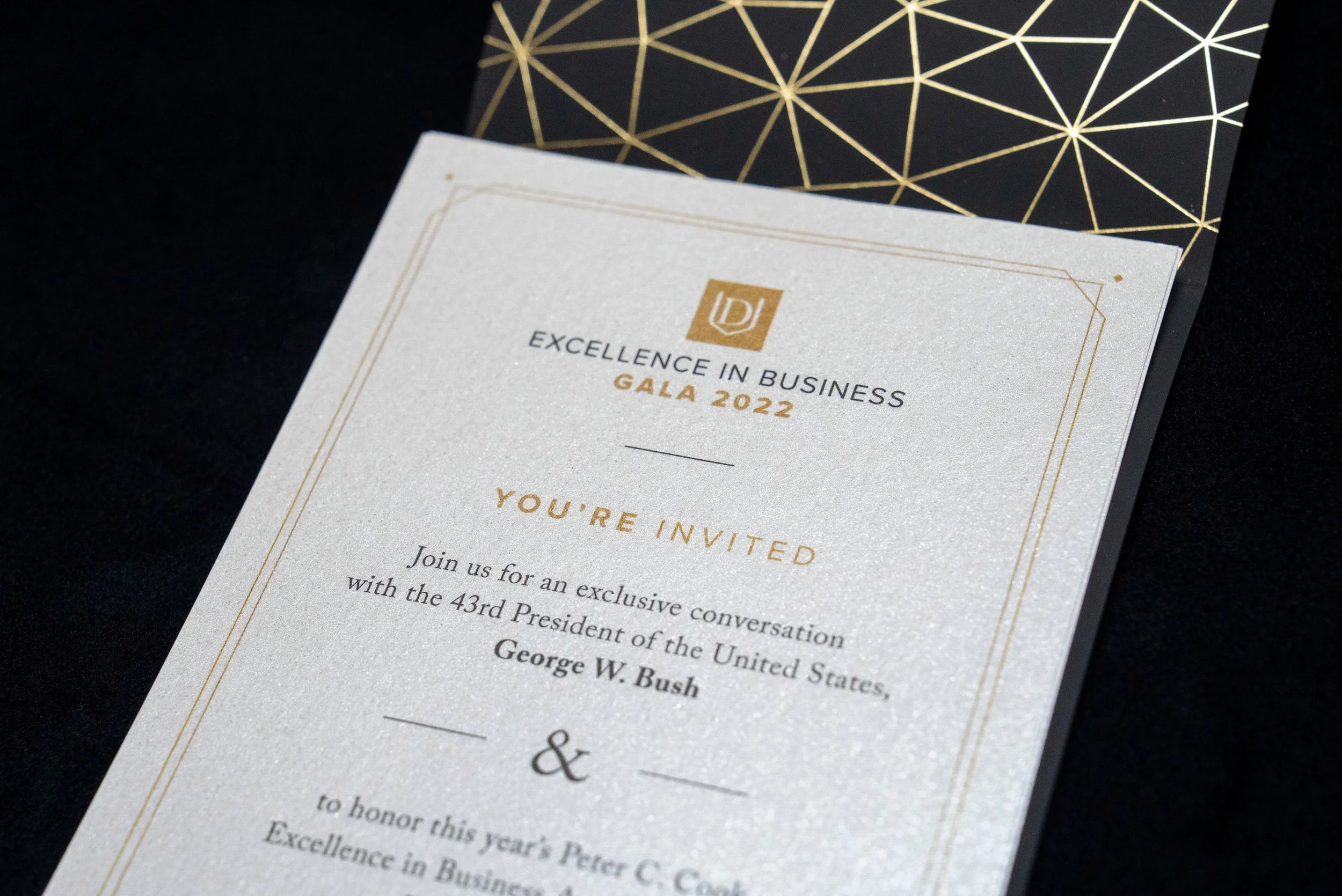 The invitation featured gold foil stamping on soft‑touch stock, echoing the elevated experience of the gala itself. Paper inserts were printed on a subtly iridescent, textured sheet, giving them a distinctive shimmer. Each production detail was selected to underscore the sophistication and prestige of this fundraising event.