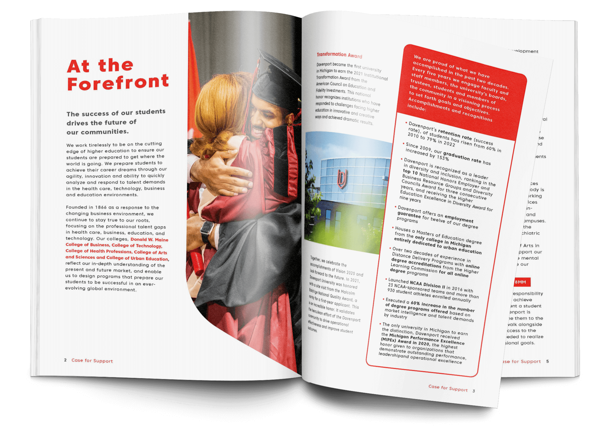 This ELEVATE Case for Support booklet is a long-form campaign piece that translates Davenport University’s Vision 2025 and comprehensive fundraising priorities into a clear, visually driven narrative. The design uses bold brand color, typography, and structured layouts to organize complex information into an accessible, donor-friendly reading experience, with a photography style and visual system that extends across campaign touchpoints such as email, social media, and web to create cohesive recognition.