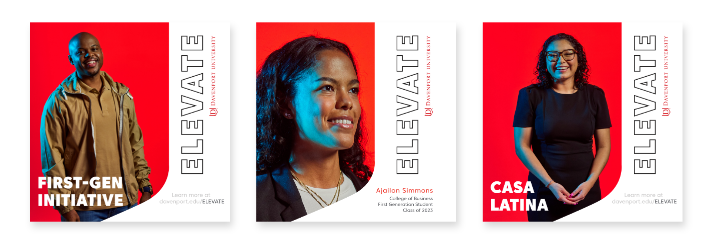 The ELEVATE campaign at Davenport University was a comprehensive advancement and fundraising initiative designed to increase access to transformative, career-focused education. As art director and lead designer, I developed the campaign name and visual identity, set the overall art direction, and executed key creative in close collaboration with the Director of Communications and the Executive Vice President of Alumni and Advancement.